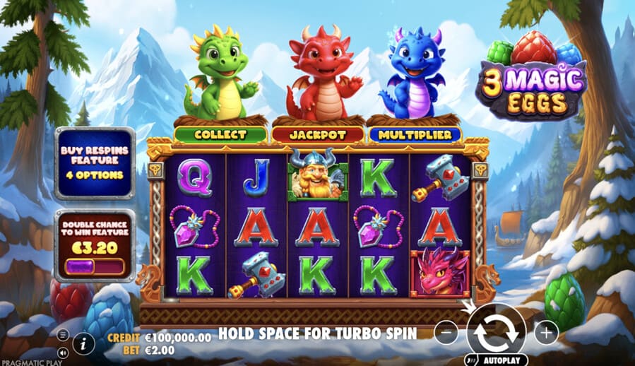 3 Magic Eggs is Pragmatic Play’s latest take on Hold & Win, but this time they’ve wrapped it in Norse fantasy and given it three different dragon modifiers instead of the usual single mechanic.