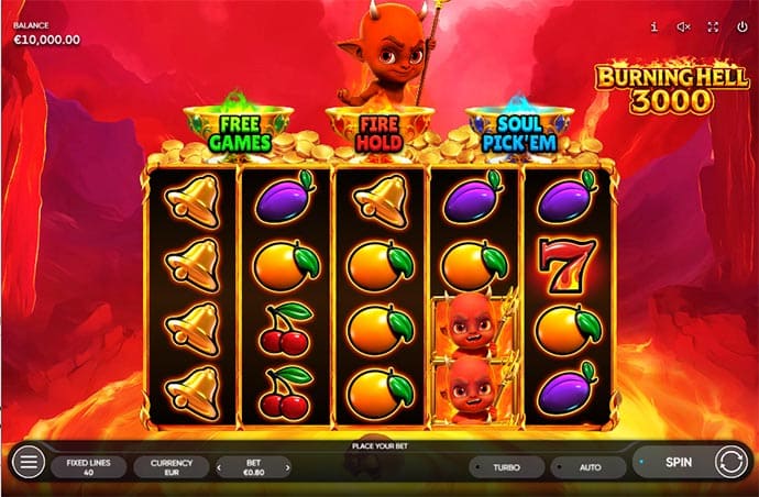 The game Burning Hell 3000 presents a cartoonish underworld which features burning fire and imps and hidden cash prizes. The visual elements create a fun burning hell theme through their bright red colors and their moving fire effects and their playful devil character who acts as both main character and villain. The soundtrack maintains energetic music throughout the game but it does not become annoying to listeners during extended playtime. Developed by Endorphina, a company that creates complex games features five reels and four rows and 40 permanent betting lines which include a Hold and Win system and Pile Feature and Pick Game and Free Games and Jackpot Collecting system combined with a humorous theme. The Burning Hell 3000 slot machine offers multiple bonus options which players can explore instead of offering only one gameplay feature.