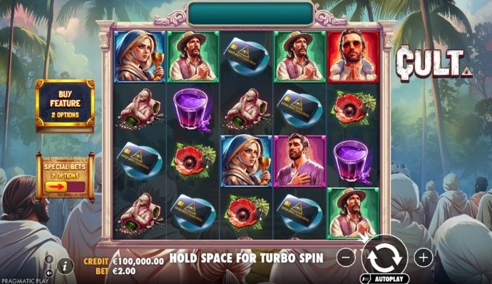 Cult is a new slot from Pragmatic Play that not only touches on the rather sensitive topic of religiosity but also raises the important issue of so-called totalitarian sects, which are mainly aimed at taking money out of your pockets rather than removing sins from your lost soul. As the popular adage suggests, creating your own religion is a great way to become wealthy. This game is an illustrative guide to how this works in practice. Spoiler alert: most often, the search for spiritual enlightenment ends in a double life, where the first is devoted to all kinds of carnal pleasures, and the second to atoning for them through endless financial contributions in favor of all kinds of churches and spiritual gurus. In general, everyone wins: you live as you wish, and spiritual leaders enjoy a luxurious life.