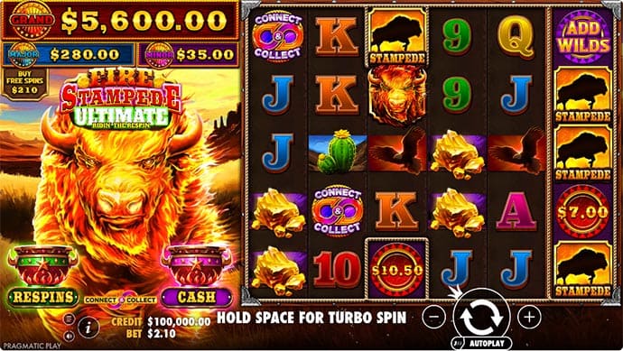 The Fire Stampede Ultimate slot machine operates through its main game mechanism which requires players to create matching symbol patterns that extend horizontally from the left side to the right side of the game grid to receive their rewards. The entire system operates through that main chain which produces all elements of gameplay including respins and cash prizes and free spins and jackpots.