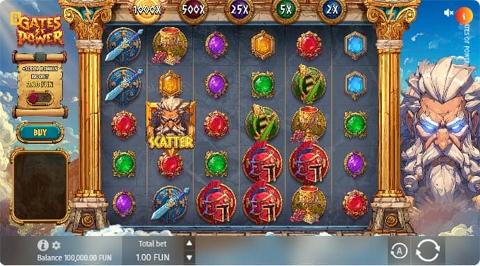 The Scatter carries Zeus' face. Landing 4 Scatters activates the Bonus round (Free Spins). Landing 5 Scatters activates the Super Bonus round, which starts with higher base multipliers. These are the primary Gates of Power bonus features trigger points outside of the buy bonus option.
