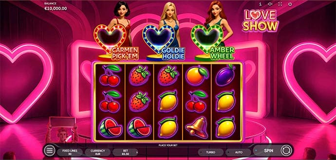 The Love Show Video Slot Machine from Endorphina offers players a 5-Reel setup and 30-payline system which the company launched on February 12, 2026 to celebrate Valentine's Day. The theme uses television dating show visuals to create its atmosphere three female hosts named Amber Goldie and Carmen activate their individual bonus rounds while the reels display traditional symbols that include hearts diamonds bells and fruit against a shiny studio background. The animation operates with fluidity while the sound design uses showbiz elements through its energetic pop music and the entire product appears to be of high quality without showing signs of excessive production work.