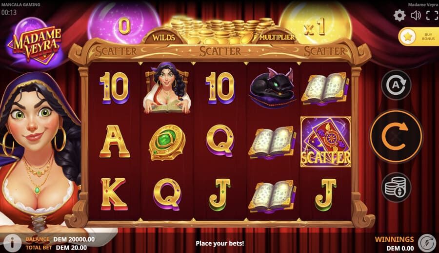 Play Madame Veyra slot in demo mode directly through our platform without registration or deposit requirements. Scroll to the top of this page and click the demo button to launch the free version, which contains identical mechanics, RTP, and features as real money gameplay. The demo provides unlimited virtual credits, allowing extended testing of Wild Collector strategies and bonus purchase options without financial risk.
