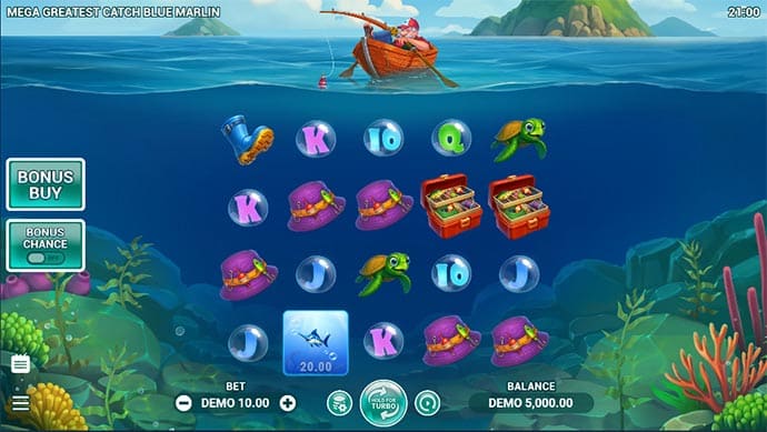 Evoplay's fisherman Harry returns for his second deep-sea expedition in Mega Greatest Catch Blue Marlin as he seeks the legendary trophy fish that swims beneath Caribbean waters. The 5x4 grid design displays above clear water which contains fish that swim through coral reefs and its lighting system adjusts according to the sun's path across the sky. The sound design combines breaking waves with tense musical elements during bonus builds to establish atmosphere while maintaining the audible mechanical sounds of spinning reels.