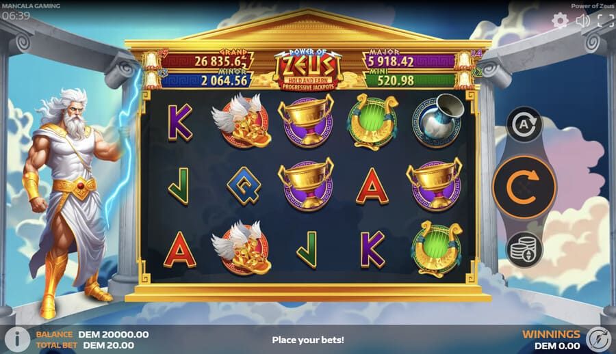 The slot operates on 20 fixed paylines across its 5-reel, 3-row layout, a traditional structure that Mancala enhances with progressive jackpots and stacking wild mechanics. Unlike competitors such as Rise of Olympus, which focuses on cluster pays and god powers, Power of Zeus leverages the Hold and Win respin format popularized by Pragmatic Play but adds multiplier pots and four-tier progressive jackpots to the formula.