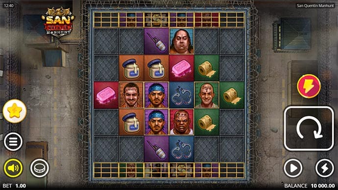 The San Quentin Manhunt demo plays identically to the real money version. All mechanics are active: Enhancer Cells fire normally, cascades build, both free spins modes trigger, and bonus buys work with virtual credits. This makes it a reliable testing environment.