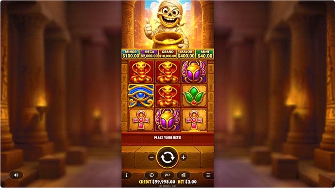 Fat Panda built the Ancient Egypt angle around specific visual references rather than generic sand-and-scarab stock art. Symbols include a mummy sarcophagus, a coiled snake, a lotus bloom, a scarab beetle and a detailed hieroglyph stone. The COIN symbol - the centrepiece of the bonus - renders as a chunky gold disc stamped with Tut's face. Colour temperature shifts noticeably when the Hold and Win round opens: the reel area lightens to spotlight each landing MONEY symbol, giving the player a clear read on grid progress without cluttering the interface.