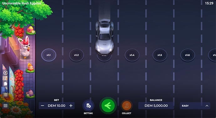 The cash out button is large enough for tap input. Autoplay configuration works through a clean modal menu. At Easy and Medium difficulty, there are no performance issues on mid-range Android and iOS devices tested. Hardcore difficulty - with maximum traffic density and fast animations - can cause minor frame drops on devices older than three years. If you play Uncrossable Rush Eggster free in demo mode on mobile first, you will immediately understand whether the Uncrossable Rush Eggster payout feels right on your device before switching to real stakes. If you notice lag on Hardcore, switch to Medium for autoplay sessions.