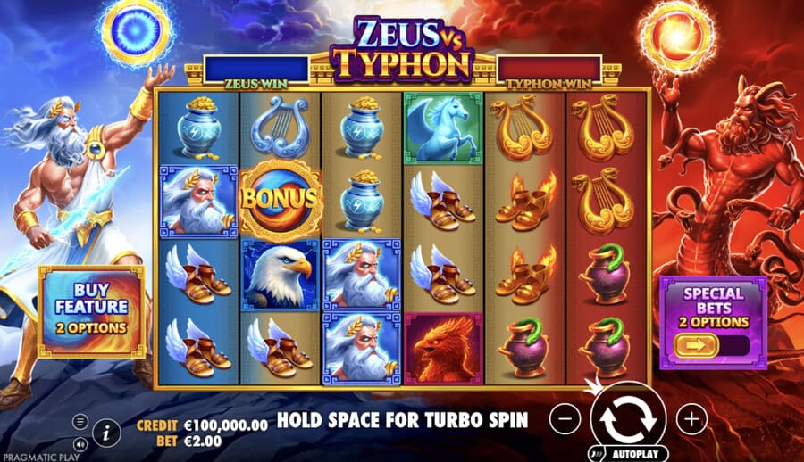 The RTP of Zeus vs Typhon is 96.49%, 95.52%, 94.49%. Greater return to player, the better your odds are.