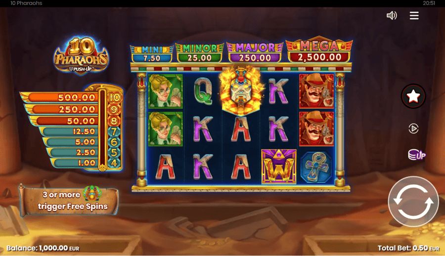 10 Pharaohs is a New Slot released by Push Gaming that treats players with sharp graphics, smooth animations, and instant cash prizes, including the Mega jackpot, which is 5,000 times the stake. Free Spins additionally boost one's chances of grabbing a life-changing win, thanks to the special gameplay mechanic allowing one to push the playfield layout up to the 5x7 size. Only imagine the maximum prize you can win through this game is x10,663. Now, let's explore this stylish video slot in more detail.