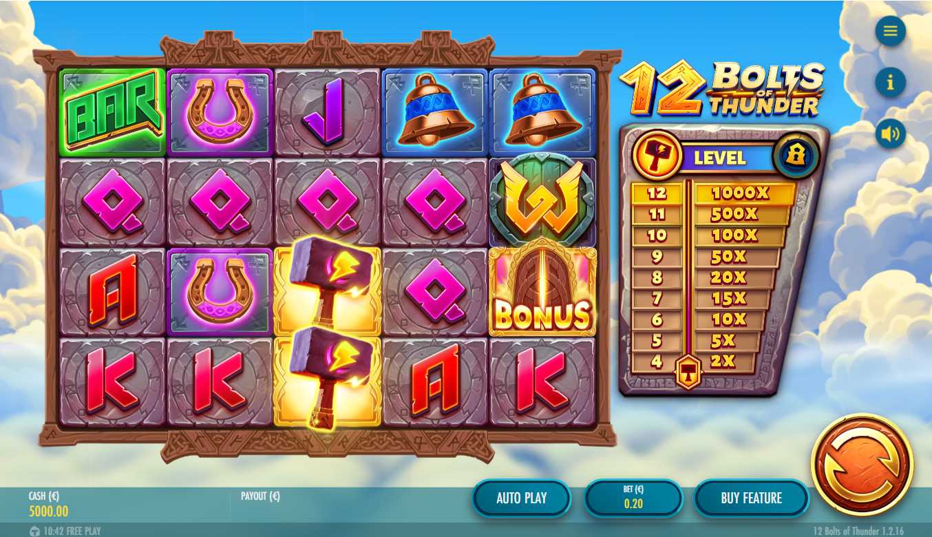 12 Bolts Of Thunder slot by Thunderkick is another journey into the world of Scandinavian mythology that promises intriguing features and generous rewards. Against a simple cloudy sky background, the 5x4 layout with 20 betlines is ready to lure you into a pleasant atmosphere. Although Thor is nowhere to be seen, his hammer is still ready to award you incredible Hammer Wins of up to x1000 your bet, which you can track on the right side of the main grid. And what's more, 3 Scatters trigger Free Spins where you have a chance to boost those Hammer Wins and achieve a x30000 Max Win Multiplier! Each rewarded Hammer Win also grants 3 extra spins, prolonging your excitement. Experience an incredibly enjoyable slot that reimagines Norse themes and offers an unforgettable gaming adventure.
