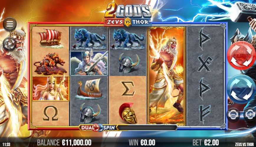 In the new video slot 2 Gods Zeus Vs Thor you will witness the battle of the mighty Zeus and Thor. 4ThePlayer debuted new and unique Dual Spin mechanic, which will give you an opportunity to double the win on every spin. Playing this slot you have to choose whose side you are on.