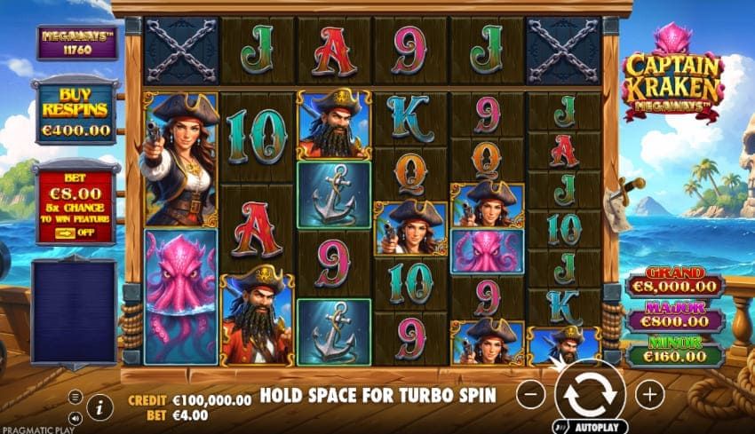 Captain Kraken Megaways is a New Slot from Pragmatic Play that invites you to participate in an unforgettable sailing experience saturated with booming cannons, crying hungry seagulls, and creaking rigging during the sharp maneuvers of a sailing ship. So if you are excited about the opportunity to embark on a dangerous but immersive high-seas quest alongside the fearsome Captain Kraken and his lovely female companion, it's time to launch the game on your device so that you feel the salty breeze carrying the scent of mind-blowing winnings you may get, thanks to the unbelievable Megaways mechanics supplying up to 200,704 pay lines per round due to ever-changing reels. Furthermore, several bonus features involved make each spin unpredictable, providing a massive adrenaline rush. These include cascading wins, Money symbols that offer instant cash prizes up to x2,000, and a Respin mini-game with lucrative Cash-collecting gameplay mechanics.