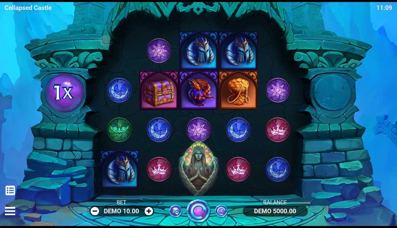 Collapsed Castle is a magical world-themed slot. In the background, there is a picture corresponding to the name - the ruins of an old castle. The playing field looks like an old fireplace with a hint of mystery. To the left of the playing field, there is a round counter with the value of the multiplier. All symbols look like they are the emblems of the clans that lived in this castle, and each of them has its own talisman, which is expressed in one of the highly paid symbols. The game attracts not only with well-drawn graphics but also with interesting mechanics. You will always have a multiplier that will help you love this game even more. The melody helps to create an atmosphere of mystery and magic.