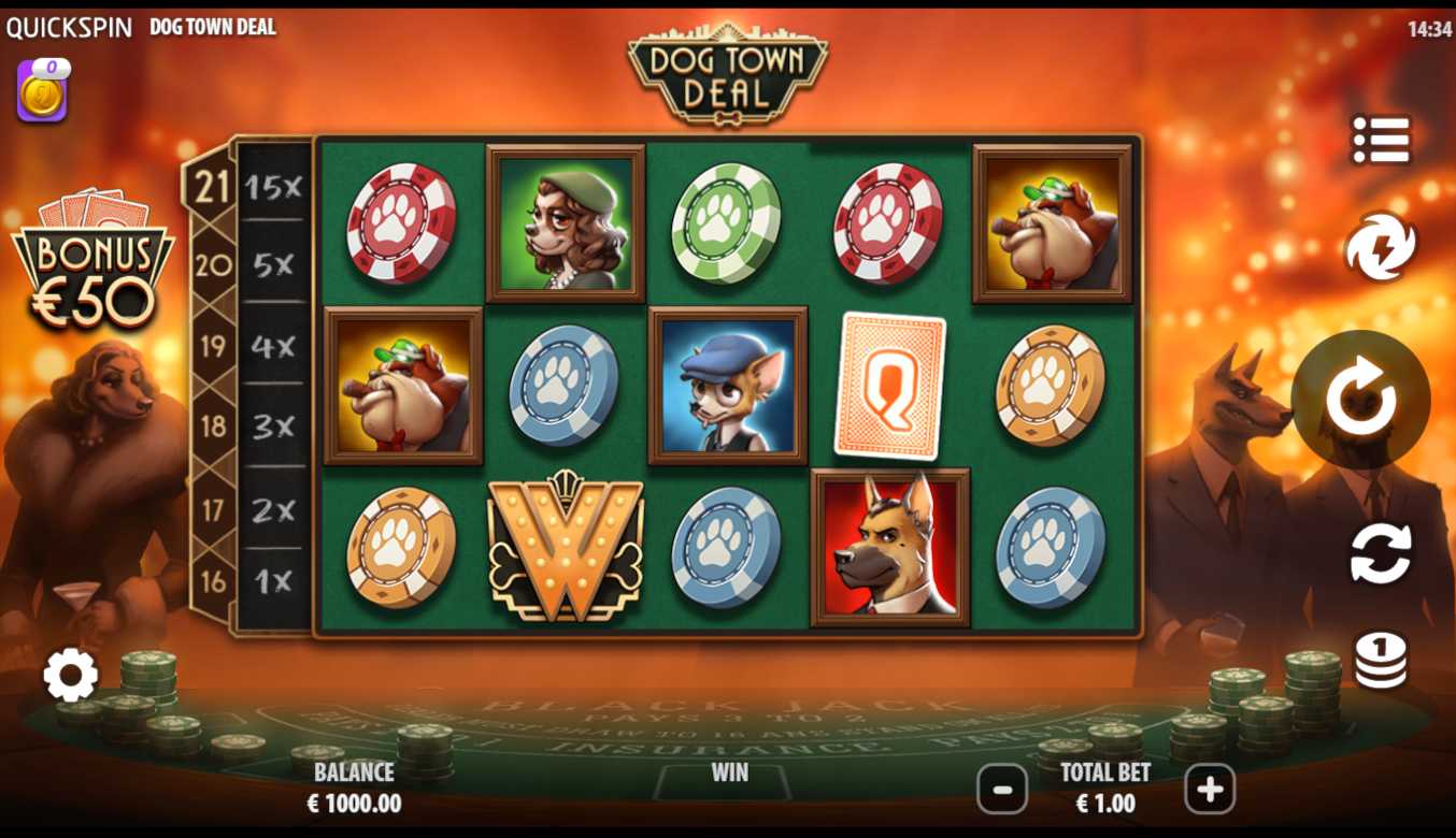 Picture this: a smoky jazz club in Prohibition-era New Orleans, where a pack of sharply dressed canines gather around a felt table, shuffling cards and raising bets. The Dog Town Deal slot game by Quickspin transforms this whimsical premise into a medium-low volatility experience that combines classic slot mechanics with blackjack-inspired bonus features. The 5x3 grid hums with 1920s atmosphere - trumpet riffs punctuate each spin, while stylized dog characters (a German Shepherd in a fedora, a Bulldog with a cigar) populate the reels alongside playing cards and whiskey bottles. After testing 200+ spins across demo and real money modes, this review breaks down whether Dog Town Deal delivers consistent wins or just tricks.
