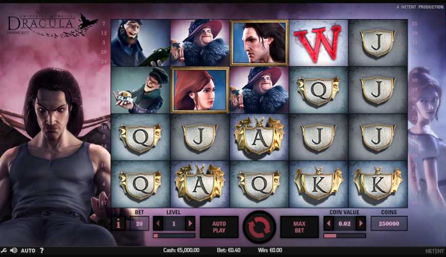 In the main game, you get 10 Free Spins when the stacked Dracula symbol shows up on reel 2 and the stacked Lady symbol shows up on reel 4. Every time the reels spin in Free Spins, bats swoop down and land on them. During Free Spins, the Bat feature can be used only once per spin. When the Stacked Wild symbol shows up on reel 3 during Free Spins, you win two more Free Spins.