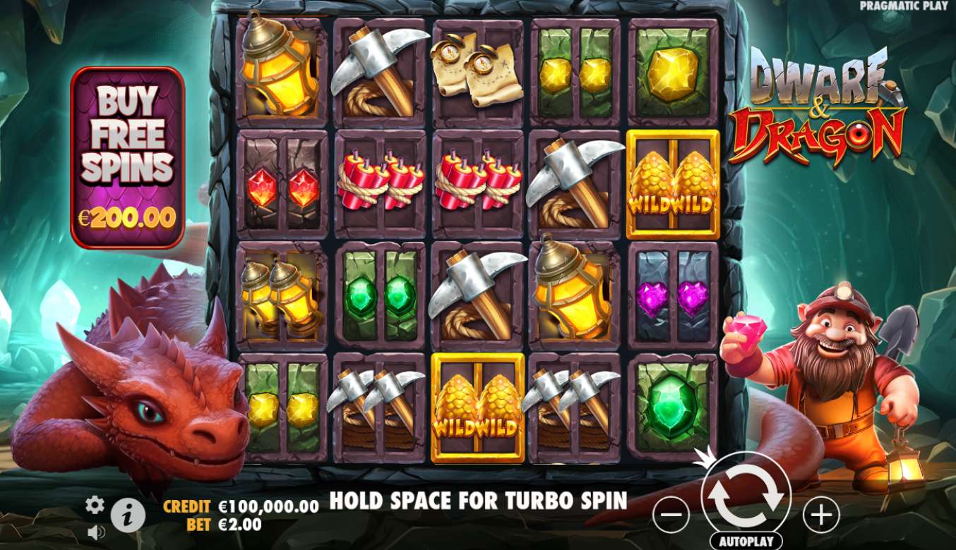 Dwarf & Dragon slot by Pragmatic Play takes you to a fantasy world where a dwarf miner and his adorable dragon companion mine for various gems. The charming cartoonish graphics suit this slot well as it offers a 5x4 layout and 1024 ways to win, with an incredible potential of up to a 14000x Max Win Multiplier, depending on your bet ranging from €0.2 to €240 per spin. Encounter split symbols and Wild symbols, which are divided in two and carry multipliers, and get ready for the Free Spins feature, triggered by three Scatter symbols or Bonus Purchase, offering both re-triggers and even more thrilling gameplay. Embark on your adventure into the depths of underground mines and immerse yourself in a world of whimsical wonders and discover the thrilling features that promise exciting gameplay and bountiful rewards.