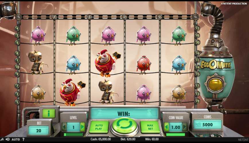 The opening video for EggOMatic explains the game's plot: because the egg factory's productivity is low, the lead rooster creates the EggOMatic to produce more eggs. The reels are incorporated within the machine rather than being in a typical reel configuration, and the images are further enhanced by the strong retro atmosphere. Different types of robotic chickens with higher-value designs serve as symbols. The artwork is excellent overall, particularly the symbols. They are quite well-drawn and detailed, so if you appreciate visually beautiful games, you'll probably really like this one! This slot machine and conveyor belt create mechanical manufacturing noises when moving, and a humorous melody that you can hear is playing in the background. Every time the Wild rooster successfully captures an egg, he crows and clucks joyfully, and a flurry of money falls to celebrate the victory.