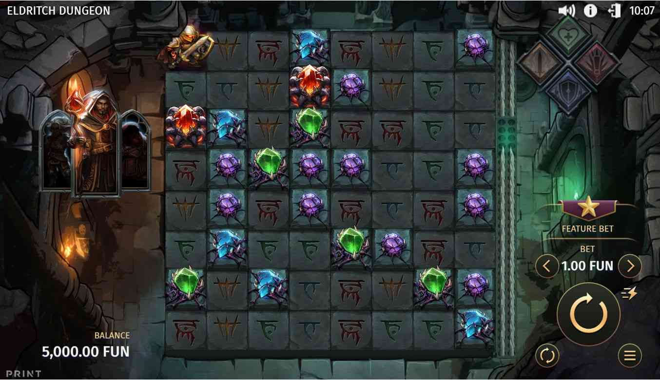 Eldritch Dungeon by Print Studios is an atmospheric slot where you take on the role of the hero and plunge into the depths of a dark yet captivating dungeon. The game boasts a vast 8x8 layout, rewarding you with wins for 5 or more matching adjacent symbols, clearing the way for a brave knight who serves as the Wild symbol. Along the way, fierce monsters will cross your path and defeating them will strengthen your hero, triggering bonuses on the grid such as transforming 10 or more symbols into one and landing Random Wilds. The knight’s journey leads to the entrance of the boss’s lair, triggering the Dungeon Battle mini-game, where only you and your sword stand between you and the x20000 Max Win Multiplier. Experience epic monster battles and join forces with allies to face the final enemy and plunder the legendary treasure trove.