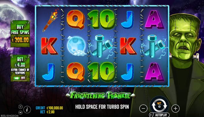 You can play Frightening Frankie for free right on our site, anytime, with no money deposited, as bets are made via mock currency. Registering is also not required. To launch the slot, navigate to the top of this post and push the ‘Play Demo’ button.