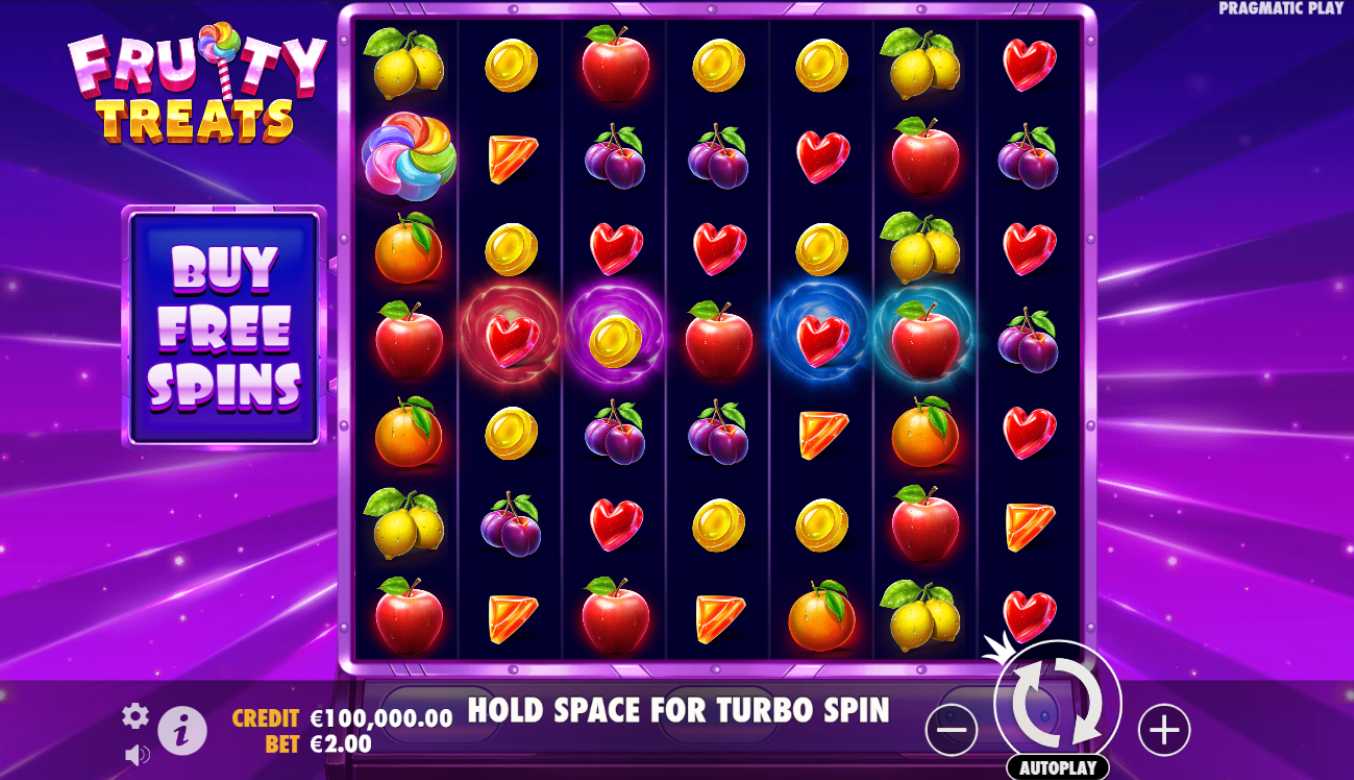 Fruity Treats by Pragmatic Play, a slot with a fruity themed slot with beautiful animations, exciting features, and plenty of winnings. Place bets from €0.2 to €240 per spin and embark on a juicy adventure across a 7x7 layout, where wins are paid in blocks of at least 5 symbols, clearing winning combinations and replacing them with new symbols cascading from above. Keep an eye on frames with progressive multipliers ranging from 5x to 20x, moving across the grid with each spin, with the multiplier increasing as you win. Even more fruity madness awaits you in the Free spins, triggered by Bonus Purchase or three or more Scatter symbols, promising even more wins with each spin, up to a 5000x Max Win Multiplier. Get ready for a fruity frenzy in Fruity Treats combined with interesting features as well as great visuals.