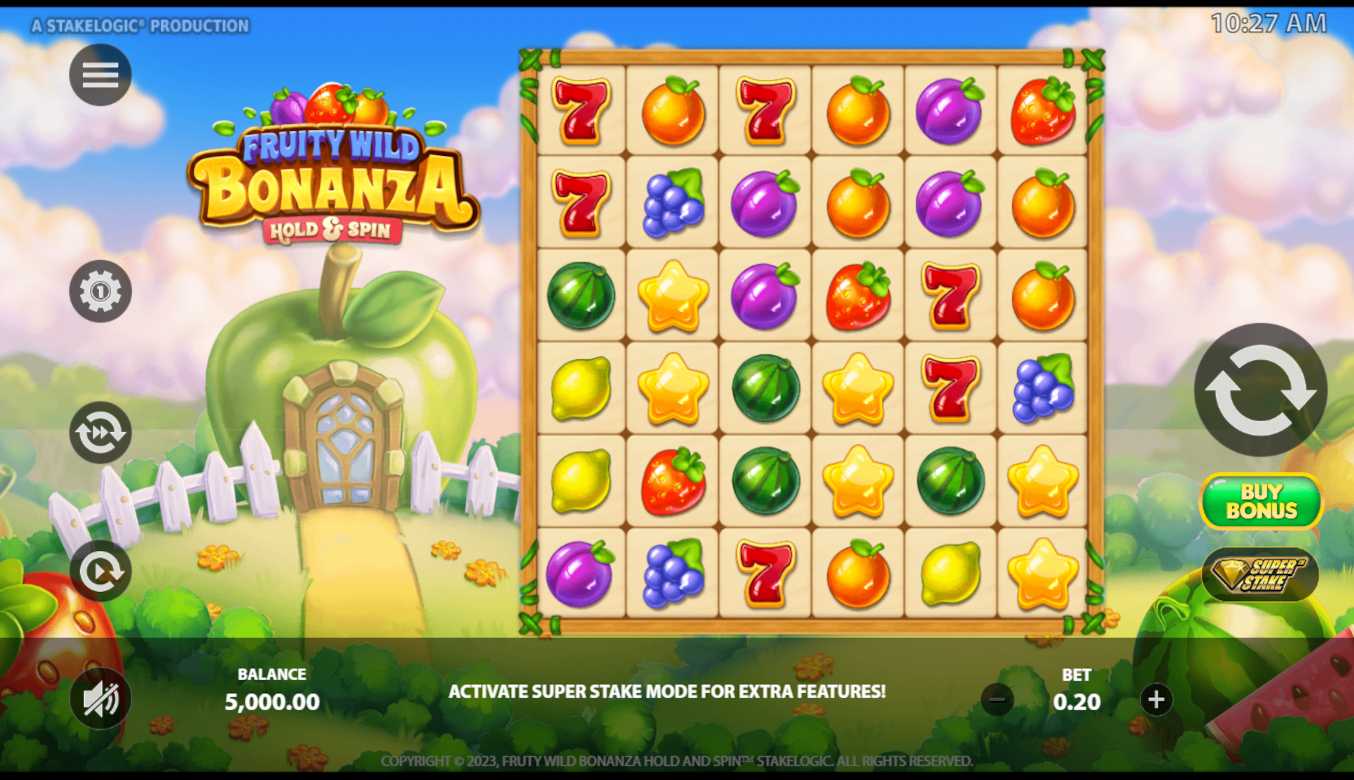 Fruity Wild Bonanza Hold and Spin, a slot machine that is played on a 6x6 screen, is a combination of traditional fruits and contemporary cluster-wins action created by StakeLogic. We dive into a very adorable universe that appears to have been made with young toddlers in mind. The player is greeted by a scene of verdant hills that looks cartoonish. Large fruits are scattered throughout the screen's corners, and there is a green apple-shaped home with a wooden entrance to the left. This game comes with a unique Hold and Spin feature, where you can gather rewards, bonuses, and a shot at the top award. Read our review to be prepared for all the nuances this game has in store for us!