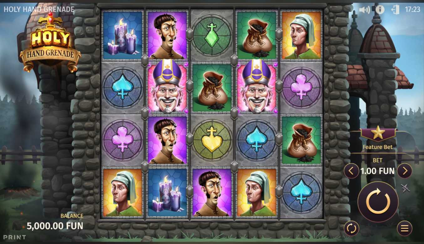 Free Spins. The free spins function begins when you hit 3 or more scatters. You receive 7, 9, or 11 free spins if you get 3, 4, or 5 scatters, correspondingly. The playing field in this bonus feature expands to 6X5, providing you 52 paylines. When holy hand grenades are landed, they will once more detonate to disclose a random number of a particular symbol type, just like in the basic game. A holy hand grenade's detonation leaves a frame that can be used by the subsequent rotations. A frame will produce a new holy hand grenade if a detonation from a new bomb strikes it. A new holy hand grenade with a bigger explosion will be created if you are able to place one exactly in the frame. A holy hand grenade also awards you with 2 additional free plays.