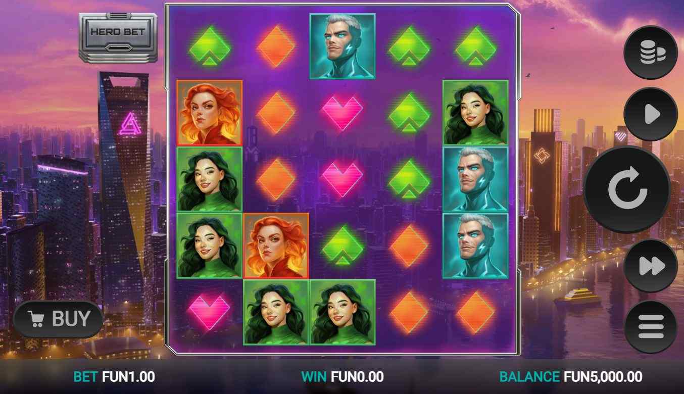 The game grid is set against the backdrop of a futuristic metropolis, offering a 5x5 layout with 15 ways to win. The maximum return to player stands at 96.1%, while the volatility soars to an intense Extreme level. The betting range is fairly standard, starting at €0.1 and going up to €100, but activating the Hero Bet at x1.5 your stake increases your chances of triggering bonus features.