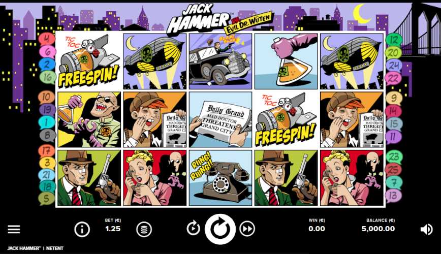 Since its first release in July 2011, the game has continued to enjoy popularity. Jack Hammer's vivid, colourful artwork that looks like old good comics may easily rival any well-known animation. The Grand City skyline and yellow-lit home windows may be seen against the purple night sky in the background of this slot. Dr Wooten's airship can be seen in the spotlight to the right of the background image. The pay lines, which are contained in something like bubbles with styles that look like comic lettering and run down the side corners of the screen, retain the slot's consistent appearance. Although this game lacks a unique background soundtrack, strong musical melodies will be played throughout bonus rounds with the sticky win. When you get a winning combination, an addicting big band anthem plays, and while playing the Free Spins feature, additional cheerful and vivacious music plays.
