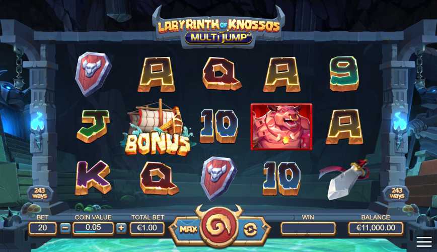 It’s a 5 reel, 243 ways game. The reels are set within stone columns located in a dungeon under the Knossos Palace. Labyrinth of Knossos Multijump slot features 11 symbols: Princess, Minotaur, Shield, Sword, A, K, Q, J, 10, 9, and the Bonus Ship.