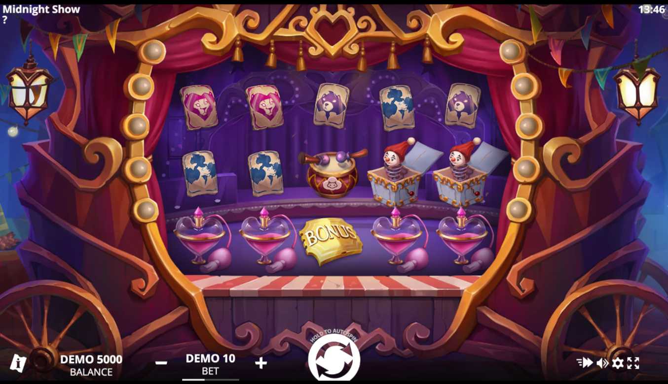 Picture the lights dimming as a mysterious carriage appears under the midnight sky. Purple and red hues illuminate a magical stage where Mr. Hokus and his glamorous assistant Annabel prepare for their greatest performance. The reels spin like a traveling circus wagon, accompanied by a haunting piano melody that builds anticipation. Every symbol comes alive through theatrical spotlights, card suits adorned with animal faces, crystal balls glowing with fortune, and drums echoing the rhythm of wins. This theatrical atmosphere defines the Midnight Show slot from Evoplay, a 5-reel experience that blends circus mystique with genuine winning potential through walking wilds, transforming curtains, and a bonus wheel multiplier reaching x80.
