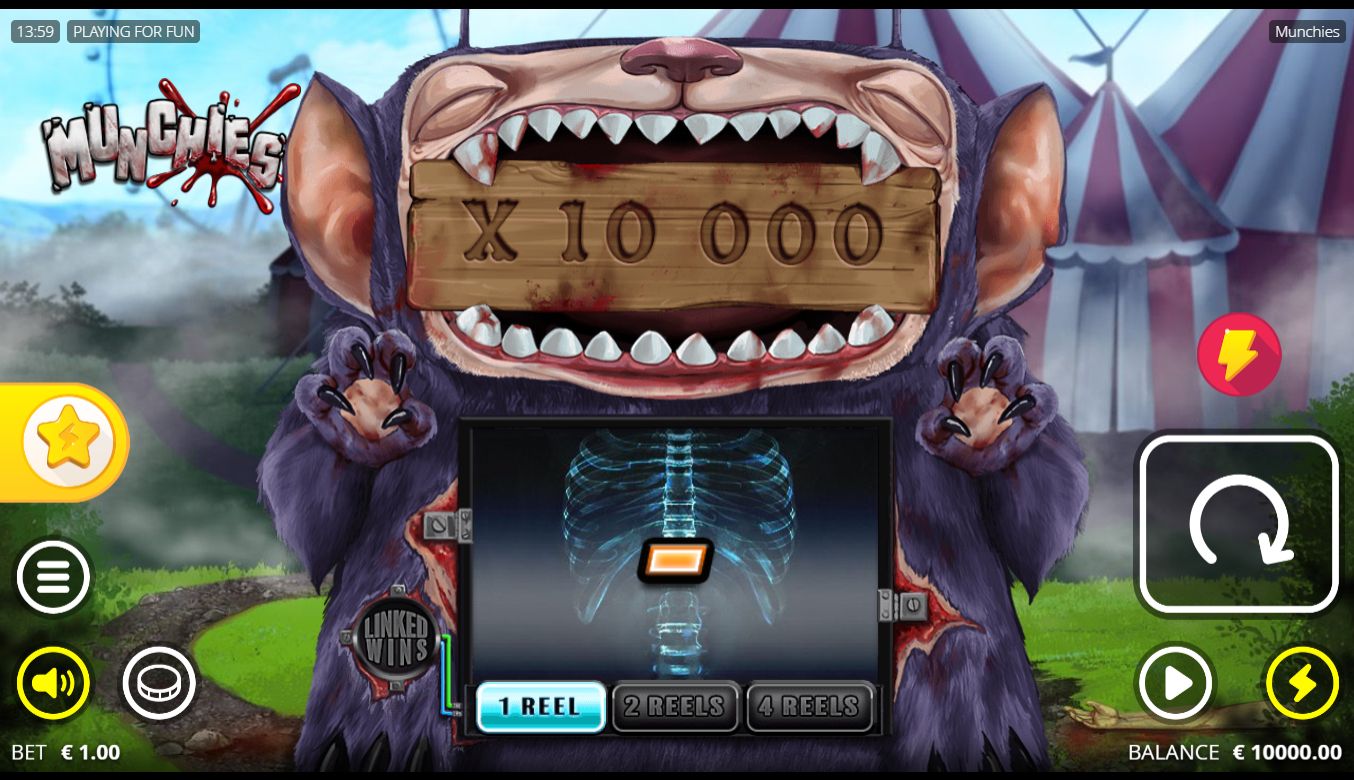 Munchies opens your eyes to a chilling scene - a deserted, blood-soaked carnival, with a grotesque creature at the centre of it all. This figure holds a sign between its jagged teeth, displaying the game's max win, a warning for those brave enough to take it on. Its stomach is torn open, revealing an X-ray screen that serves as the game grid. The unsettling sound effects only amplify the chilling atmosphere. Truly creepy, isn't it.