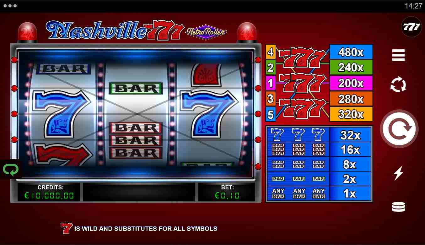 Most reliable place to play Nashville 777 Retro Roller with cash stakes is at an online casino that is: +Regulated, +Safe and secure, +Transparent, +Supports fast withdrawals, +Has bonuses and promotions, and +Offers live customer care.