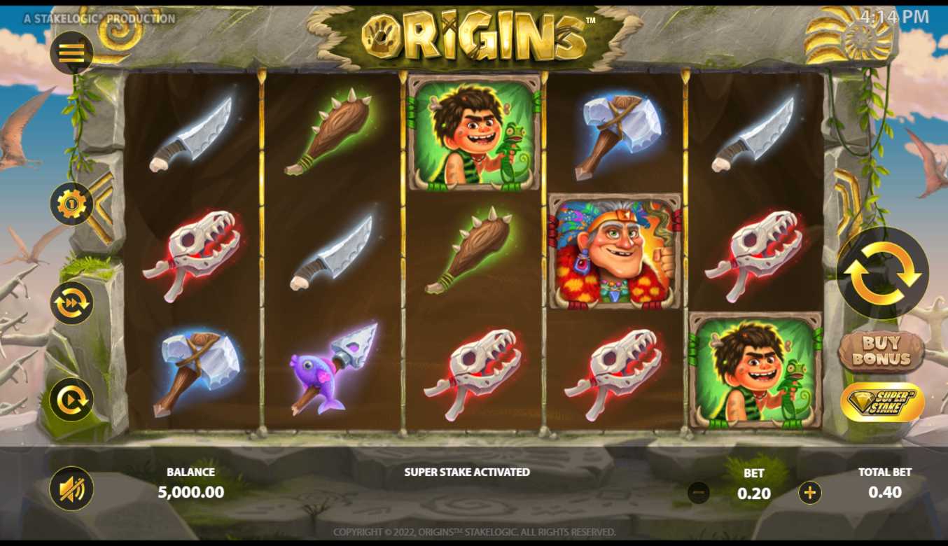 Origins is a new video slot from Stakelogic that was released on December 15, 2022. You will be transported to a period far before the invention of automobiles, factories, and other forms of contemporary technology while playing this game. This game features humans from prehistoric times using a variety of weapons, such as knives, axes, and other implements, in order to get through the day. The visual style of Origins is reminiscent of a contemporary animated film produced by Pixar or Dreamworks. The story's four primary characters, two adults and two youngsters, are presented in a straightforward and cute way. The reels are positioned inside a stone frame, and there is a blue sky with clouds visible to the sides of the frame. In addition, there is something that looks like a dinosaur flying to the right of the reels. The music in Origins is mesmerizing and features hand drums, giving the impression that it is being played by people gathered around a campfire. Read our review to decide whether it is worth your time and money playing it.