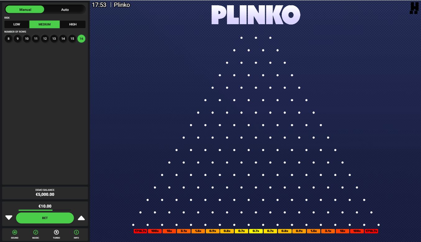 On top of that, you can tailor your gaming experience to match your style by selecting one of three risk levels: High, Medium or Low. You can also adjust the number of rows, ranging from 8 to 16, to make your gameplay as flexible as you need it to be, allowing you to fine-tune the balance between risk and reward.