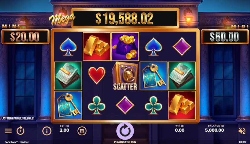 Get access to a vault with untold riches in NetEnt's Pork Knox slot. The whole theme of the slot revolves around money, wealth and safes. Nice cartoonish graphics depict the entrance to the bank building where the reels are located. All high-paying symbols are money, gold and safe keys. Above the reels is the value of the progressive jackpot, which is waiting for its winner. There are also two smaller jackpots on the sides. A large number of bonus features are waiting for you in the game to entertain you and surprise you with pleasant rewards.