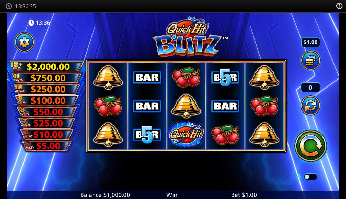 Of course, it's possible to launch the Quick Hit Blitz Blue slot in demo mode, instantly, with no login.