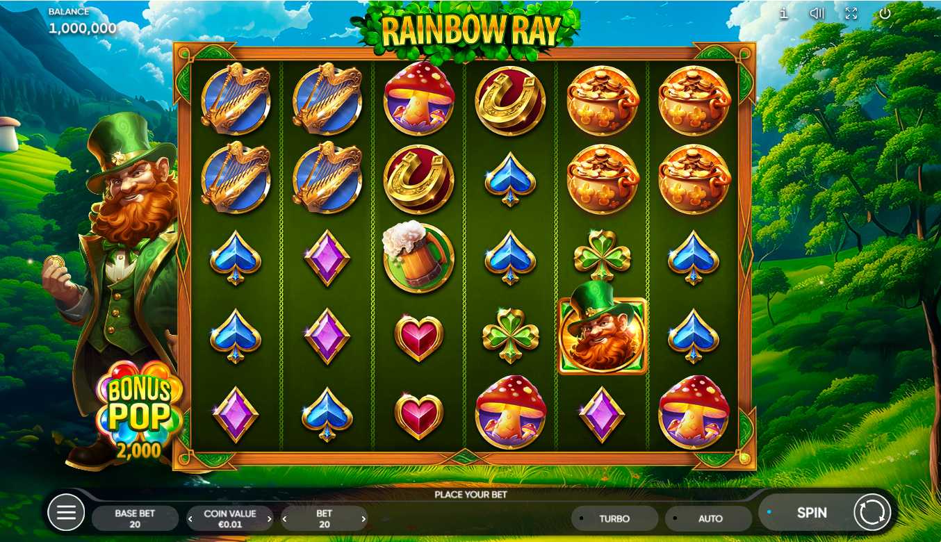 Rainbow Ray slot by Endorphina will once again immerse you in the colorful world of Leprechauns, where impressive rewards and entertainment await you. Featuring a 6x5 layout, where all symbols are scattered thanks to the Scatter Pays feature, counting at any position and disappearing to replace winning symbol combinations with new ones. The game promises an exciting potential with a maximum win of x6000, which can only be enhanced by the betting range of €0.2 - €100 per spin. Keep an eye on the Scatter symbol in the form of a leprechaun: when 4 appear, they trigger Free spins with the chance of re-triggering, where you'll encounter Multiplier symbols as well as Magic Clever symbols, which remove all symbols horizontally and vertically, keeping your attention until the end of the spins. For quick access to Bonus spins, use Bonus Purchase, and if you want to double your winnings, take a risk in the Gamble feature! With every spin, Rainbow Ray is ready to entertain you and lead you to great fortune in this magical valley.