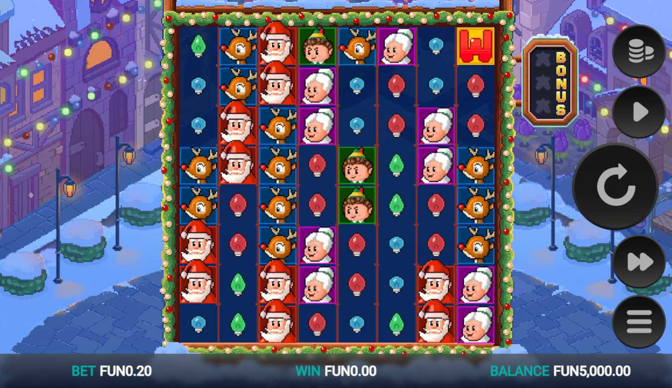 The Secret Santa feature is activated if a winning cluster has a Wild symbol as one of its components. After the feature has been activated, the winning cluster will be replaced with Mystery symbols, and a free re-spin will be granted with the mystery symbols remaining in their original positions. Each time a win happens next to a cluster of Mystery symbols that has already been generated, that new winning cluster likewise transforms into mystery symbols, and the player receives an extra re-spin as a reward. The re-spins will come to a stop when there are no additional winning clusters produced that include a Wild symbol or that are next to Mystery symbols. At this point, all of the mystery symbols will display the same symbol.