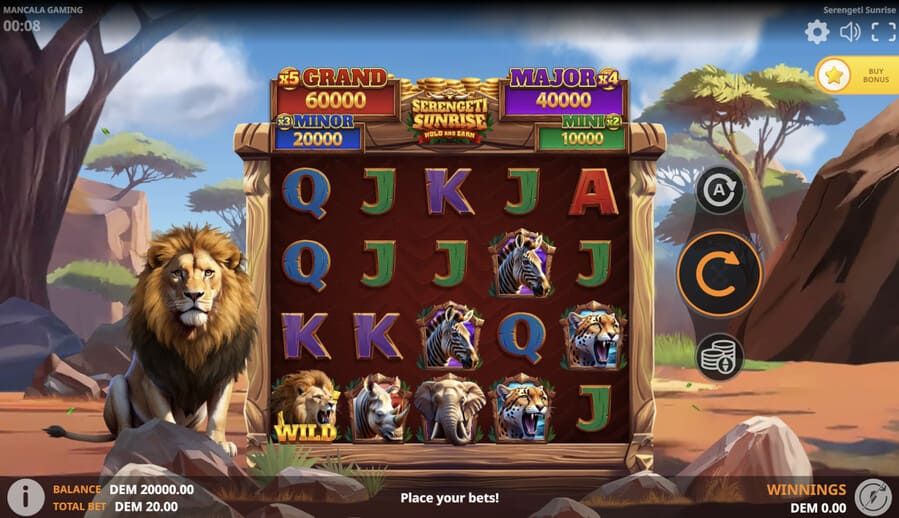 Testing the Serengeti Sunrise online slot across 500 demo spins revealed patterns consistent with its volatility rating. Base game sessions often consumed 30-40 spins without significant returns, followed by wild clusters that recovered losses in single strikes. The Bonus Buy Feature at x80 bet provides instant access to Hold and Win rounds, bypassing the wait, but this shortcut demands careful consideration given the steep entry price.