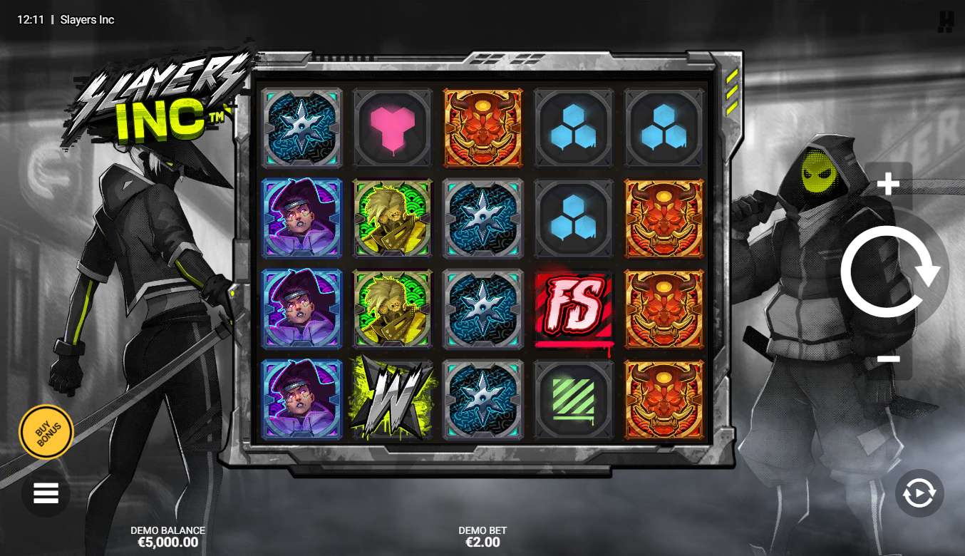 Slayers INC slot by Hacksaw Gaming plunges you into a dystopian cyberpunk world painted in noir tones, where shinobi and street warriors clash in epic battles. Your adventure unfolds on a 5x4 layout with 14 betlines, starting as soon as you place a bet ranging from €0.1 to €100 per spin, setting the stage for the warriors' confrontation. Embark on your quest for the x15000 Max Win Multiplier and discover the VS symbols, which expand to cover the entire reel, bring multipliers and turn into Wilds. Trigger Free Spins by landing 3 Scatter symbols, which play similarly to the base game but with a chance for re-triggers. Additionally, activate the Wild Slayer feature with 10 Free Spins but this time by hitting 4 Scatter symbols, where the Slicer mechanic adds a full row of wild symbols to a randomly selected row on the grid. For instant access to all bonuses, you can use the Bonus Purchase feature and to increase the frequency of Scatters, you can activate the Bonus Hunt feature. Navigate the reels like the streets of a dark city, triumph in battles, and win substantial prizes.