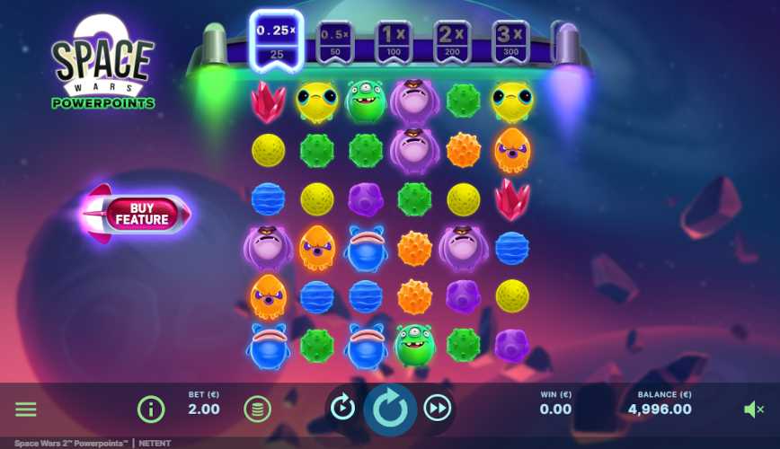 The bulk of the action takes place throughout the game's six reels, six rows in the main game and eight rows in the Free Spins. This is an N-in-a-Row Wins slot, so in order to get a winning combination you need to collect 3 or more matching symbols in a horizontal or vertical line anywhere on the playing field. Since Space Wars 2 Powerpoints is known for having a high level of volatility, you shouldn't be startled if there are sudden changes in your balance, instead, you should modify your bets appropriately. Because the return to player, which is often referred to as payout, is set at 96.05 or 92%, you need to exercise extreme caution when selecting a gaming site, as this decision might have a significant impact. You have the option of placing a bet of any value between 0.2 and 100 Euros, and the game has a Maximum Win Multiplier of x10020, which means that the game has a Maximum Win Value of 1,002,000 Euros. There are 11 main symbols plus Wild Symbol.