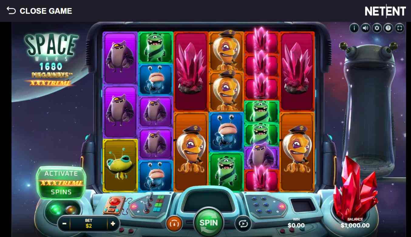 Space Wars XXXtreme Megaways is a great sequel to the Space Wars slot series that first launched over 10 years ago. Once again, the action takes place on a spaceship amidst crystals and quirky aliens, each with a unique design. Above the 6x7 layout is a control panel that interacts every time the XXXtreme mode is activated.