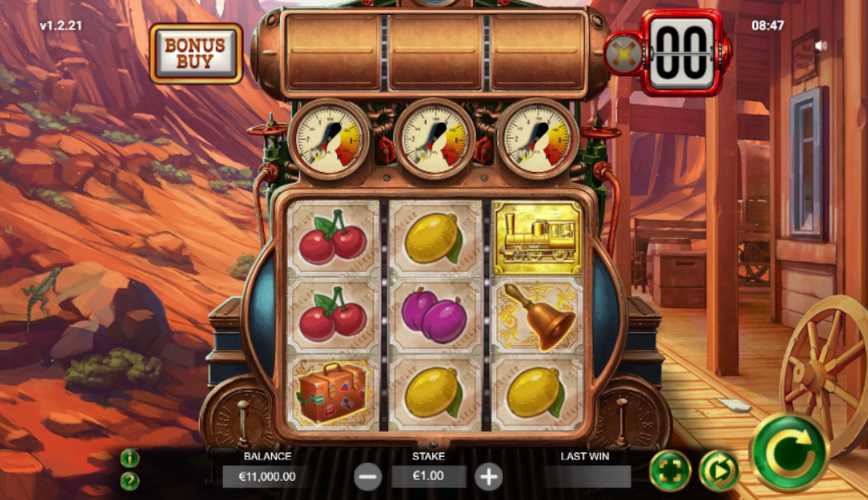 Steam Spin video slot is played on a 3×3 gameboard. As soon as you start the game you see a classic Wild West landscape with red rocky canyons and an empty town on the gold rush trail. The reels look like we are controlling this train.