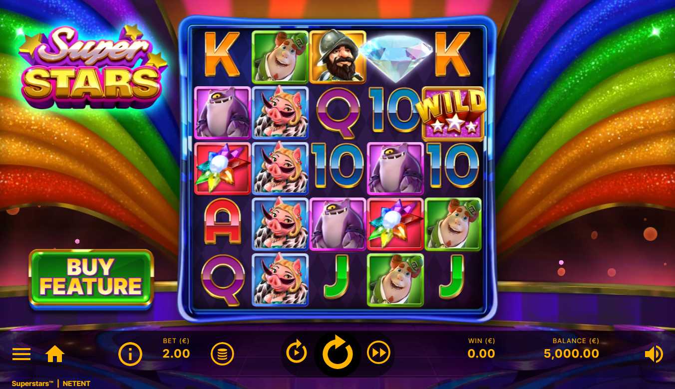 Do you want a recipe for a good NetEnt slot? You need to collect all the most famous characters from their game series and unite them in a single online slot, each with their own feature, similar to an award ceremony or Nintendo's All Star games. Regarding the atmosphere, Superstars’ base game features rainbow-style colors bursting from both sides of the screen. The big names on display here include Finn, Gonzo, Lady Pig, Brute, and a star from the famous slot Starburst. Bringing together five colossal characters from casino games must be easier than in real life. Limitless beauty is achieved by flashing lights, shimmering pyrotechnics, and unending enjoyment. Diamond Scatters, decorated with star Wilds, symbols with the highest prize represented as heroes of NetEnt slots, and the simple Buy Feature all serve the same purpose: to delight you.