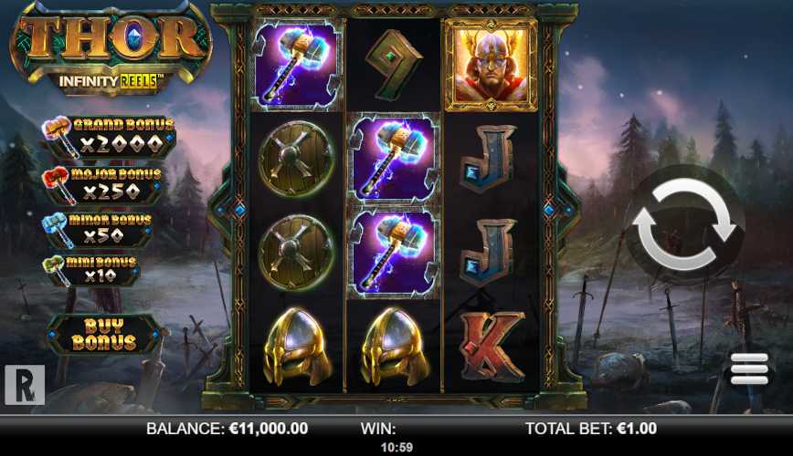 The game screen will welcome you with the Nordic mythology theme. 3x4 sized grid, built into a stone frame. In the background of the reels there are remnants of the battlefield in the forest. Through the mist you will see swords lying abandoned all over the field, and will experience the devastating atmosphere of the battle where Thor has brutally punished his enemies. With top level graphics and epic cinematic soundtrack this game the Thor Infinity Reels slot is impressively done.