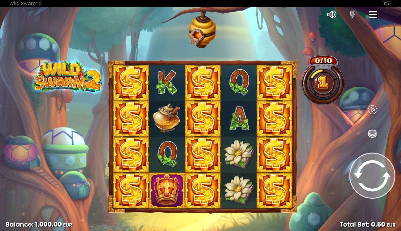 Free spins are triggered when 3 or more Scatters land on the reels. The wild bee symbol acts as a sticky Wild and appears only in free spins and Swarm Mode. Any Sticky Wilds that land will stay sticky in place for the entire feature. Filling reels 2 and 4 with Sticky Wilds activates x2 and x4 multipliers for those reels, respectively. Completely filling a reel also grants +1 additional free spin.
