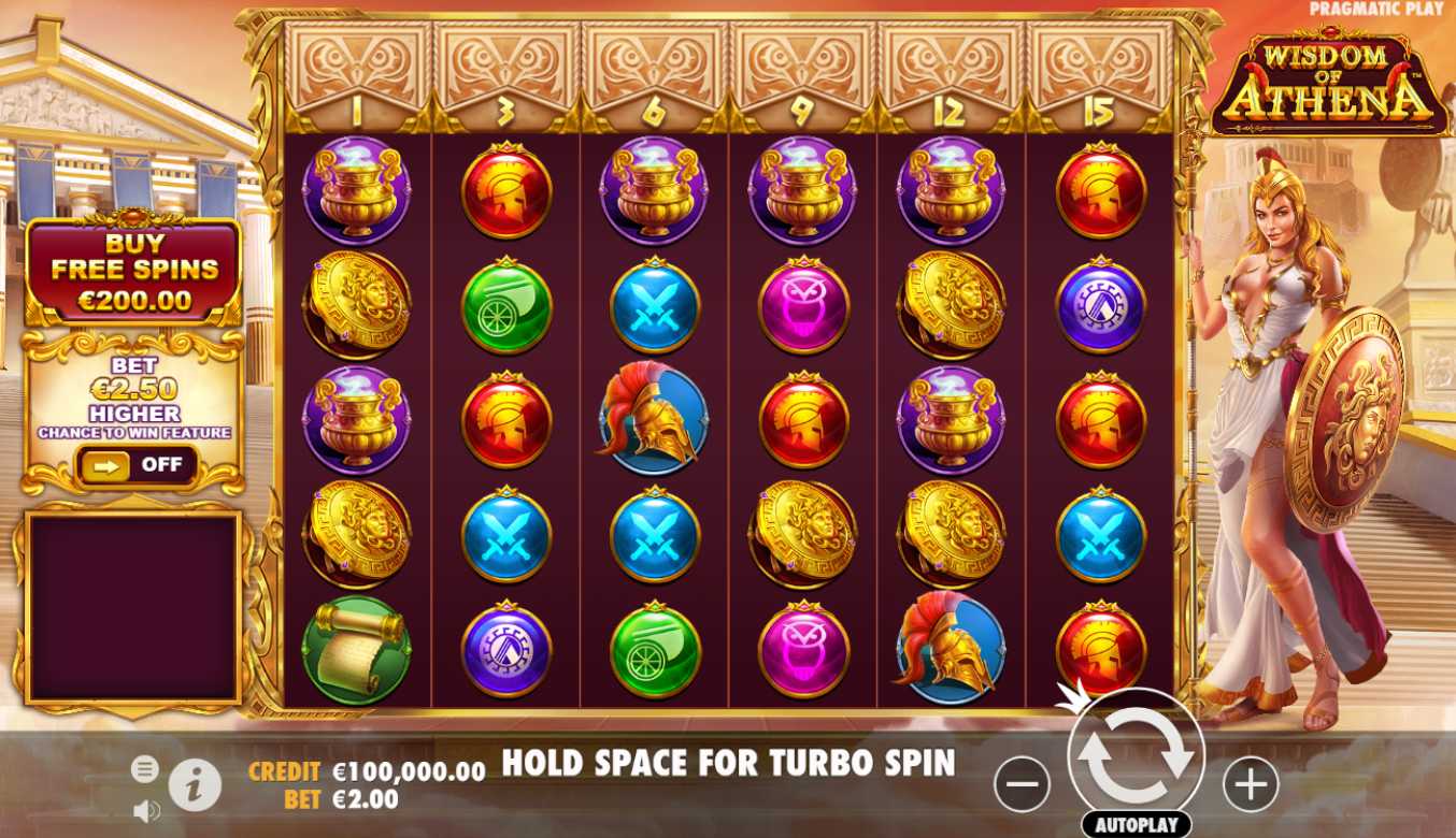 Wisdom of Athena is a slot from Pragmatic Play that was released on June 26, 2023. Play this captivating slot machine from a leading company in the market to delve into the strategic depths of ancient Greece accompanied by the goddess of wisdom and warfare. Using a non traditional payout mechanic, this fascinating game maximizes winning chances on a six-by-five grid. Prepare yourself for a highly volatile gameplay with massive payouts that could equal a respectable 5,000 times your original investment. Expanding reels, cascading symbols, retriggered free spins and easily accessible bonus rounds from the bonus buy menu are all game features. In addition to entertaining gameplay, you may have the taste of large payouts and the classic appeal of historical themes, all at a respectable RTP of 96.70 percent. Read our review to see if you will discover the treasures concealed within this ancient world.